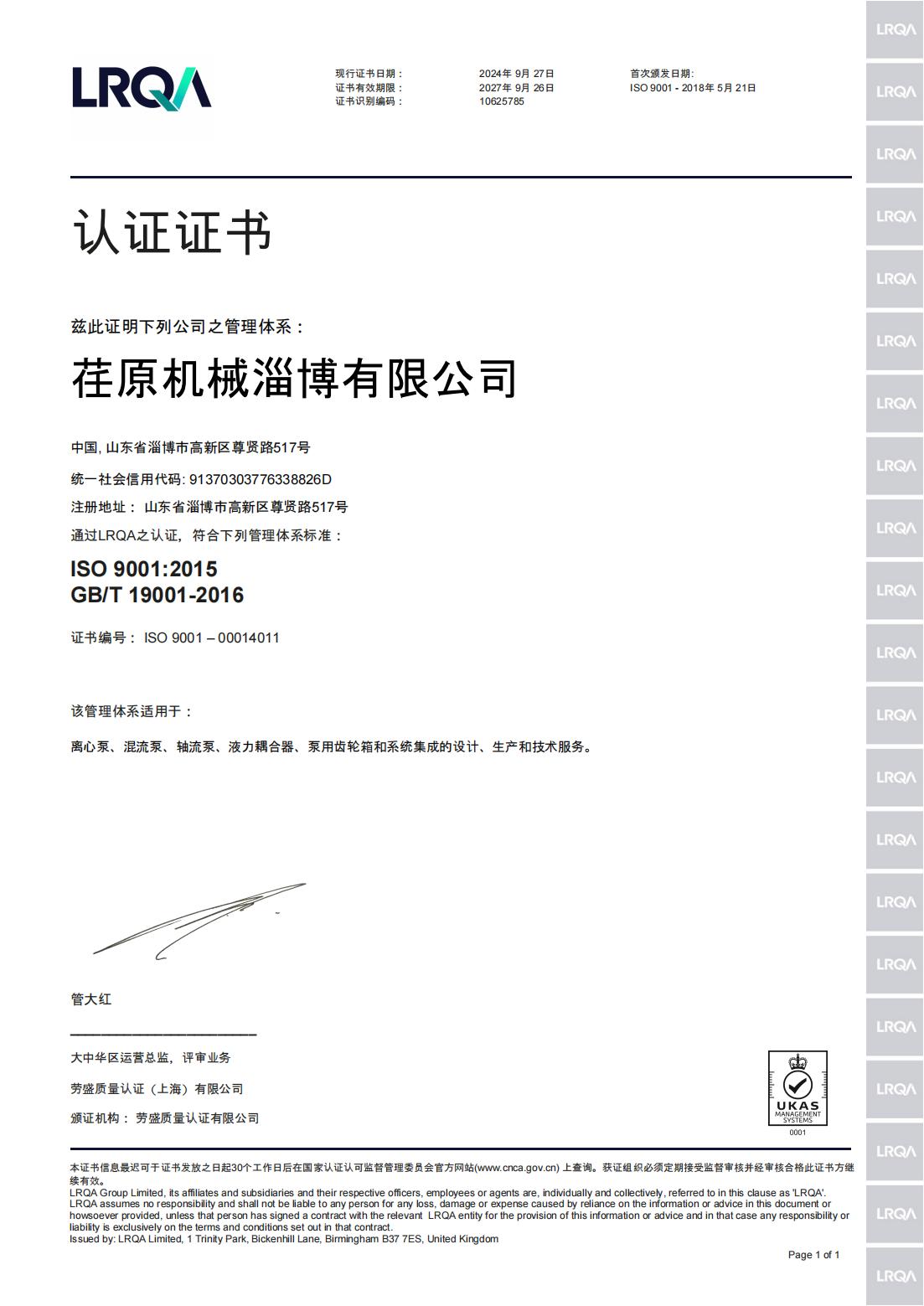 • 質量管理體系認證證書