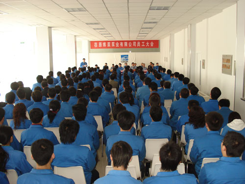 公司常務副總經理鈴木宏先生主持大會并感謝大家經過各方面的努力,使公司建成投產。人力資源部部長姜作棟先生將公司機構設置、部門人員安排及請假制度等作了介紹;總經理助理、公司辦公室主任劉擁民先生將公司員工行為準則作了介紹;最后,總經理孫龍平先生講話,孫總談到:荏原博泵泵業有限公司是日本荏原制作所與山東博泵科技股份有限公司的強強聯合。1912年做為泵的制造商起家,隨后發展成為工業機械界帶頭企業的日本荏原以其雄厚的技術實力,成為世界最大的單一泵制造廠家。而成立于1929年的山東博泵科技股份有限公司,在70多年專業生產水泵的基礎上,成為中國泵行業的佼佼者,并建立了遍布全中國的銷售網絡。荏原博泵泵業有限公司的建成投產,將在優勢互補的基礎上,發展成為高科技、高品質的世界級一流企業。