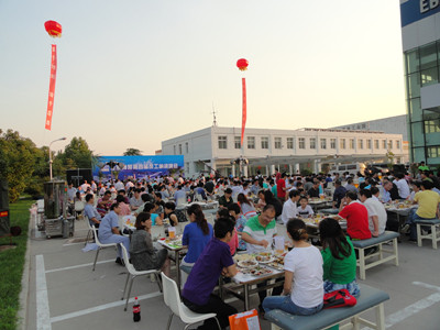 24日下午,公司辦公樓前,擺放著一排排桌椅,員工們從餐廳端著盛滿豐盛食物的餐盤,擺放在餐桌上。南面的舞臺(tái)上,工作人員在緊張的調(diào)試音響,兩只紅色的氫氣球飄揚(yáng)在空中,在蔚藍(lán)的天空映襯下,格外的鮮艷,為整個(gè)會(huì)場(chǎng)增添了喜慶的氣氛。